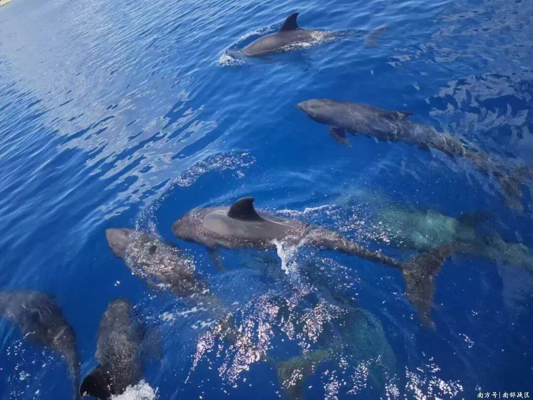 成群的海豚在礁盘周边逐浪嬉戏
